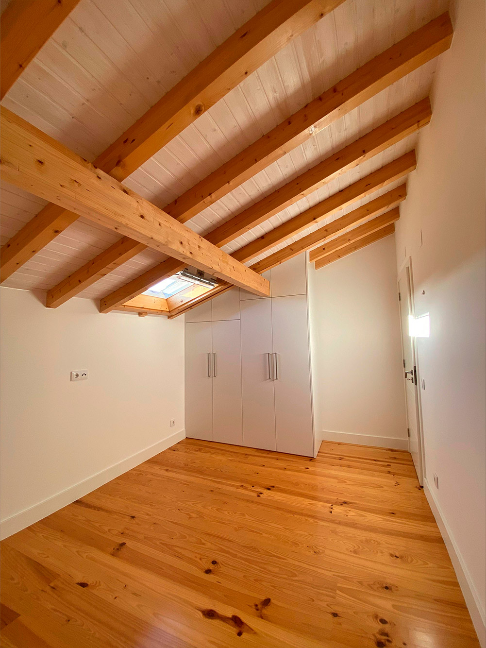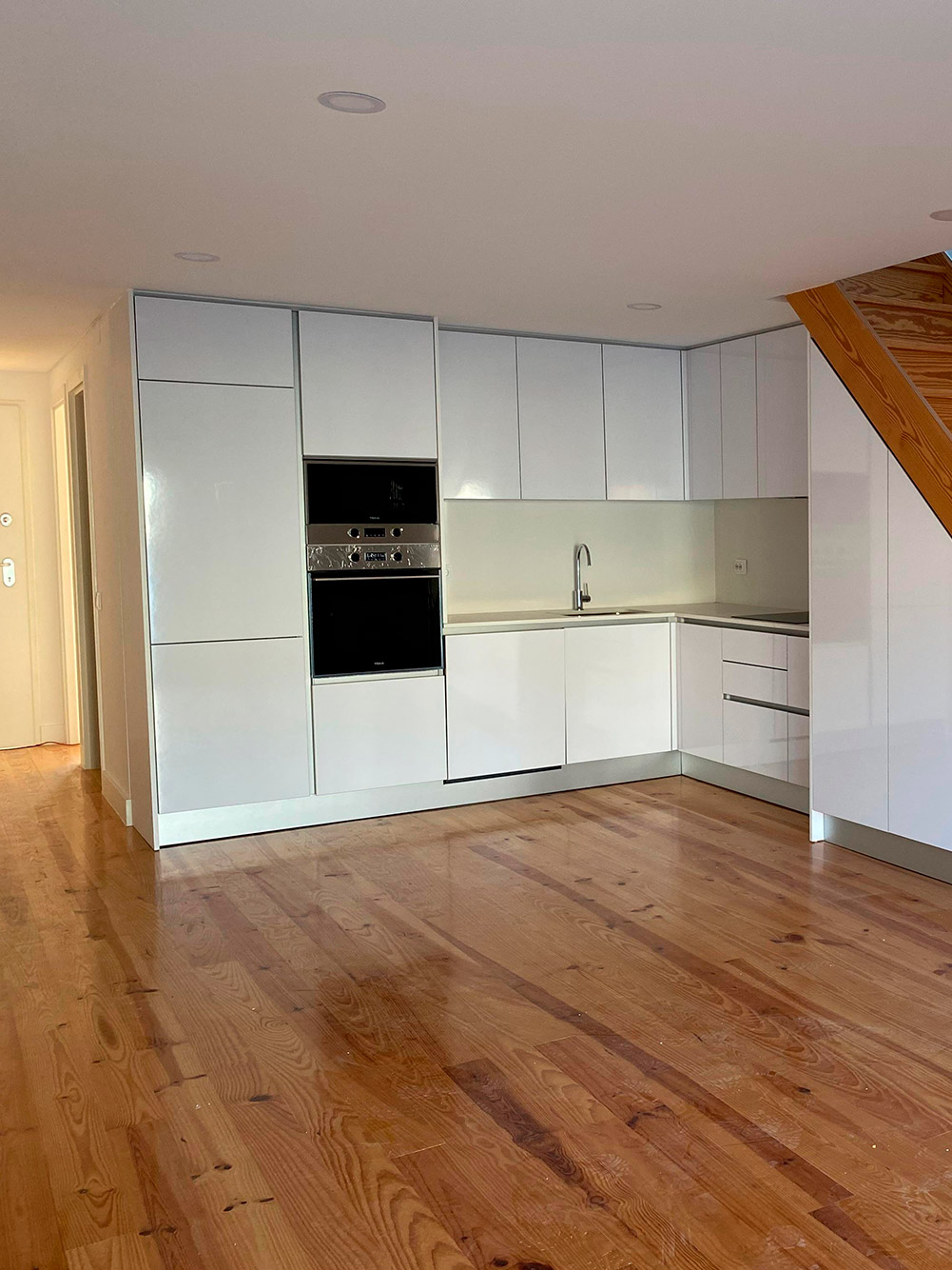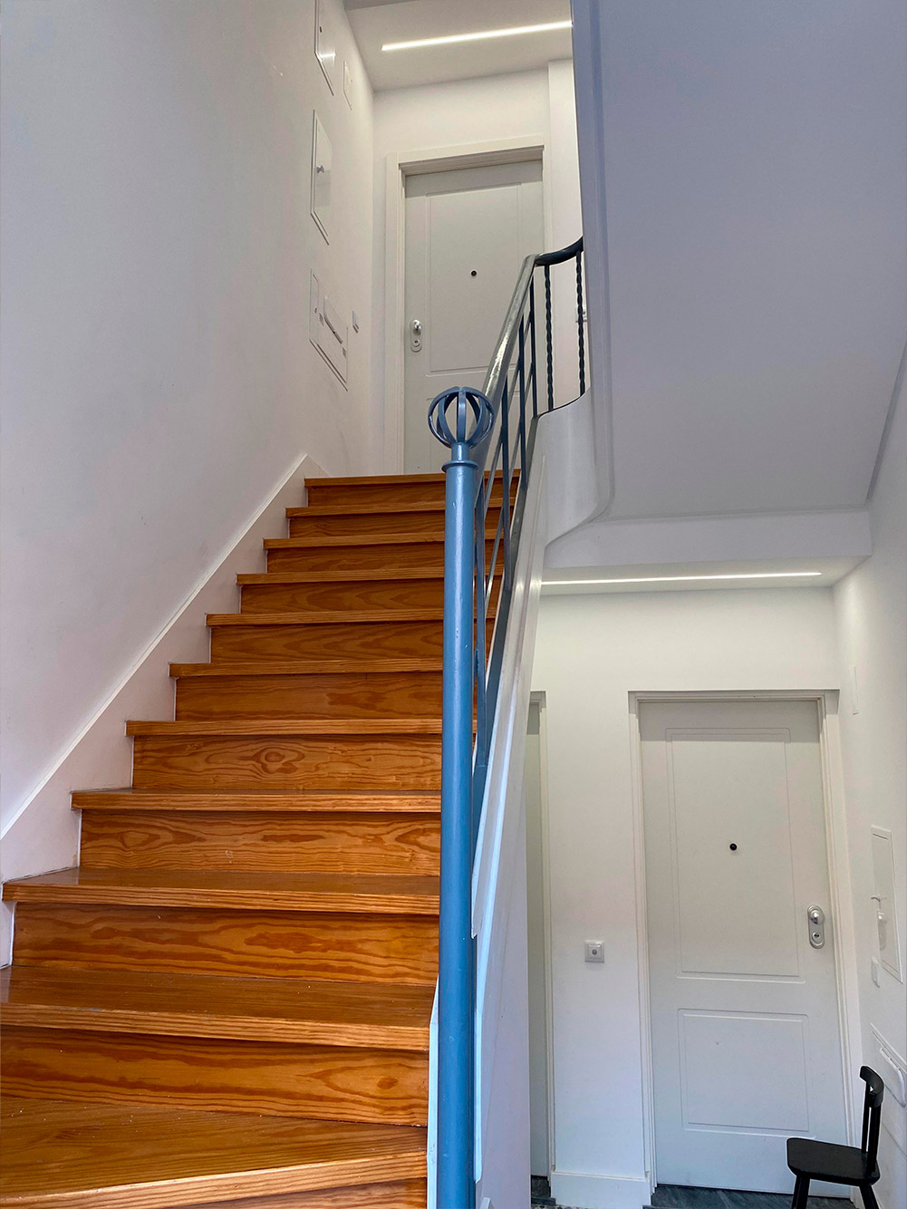 A intervenção incluiu trabalhos de estuque e pintura, reabilitação de elementos degradados, e a renovação das zonas comuns, respeitando a identidade do edifício e as exigências técnicas da obra.