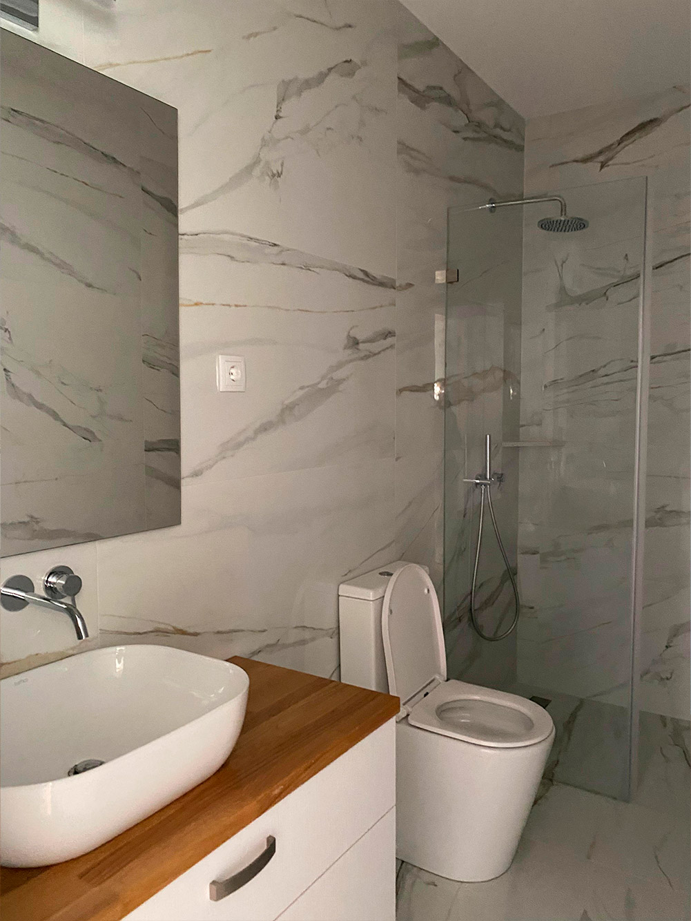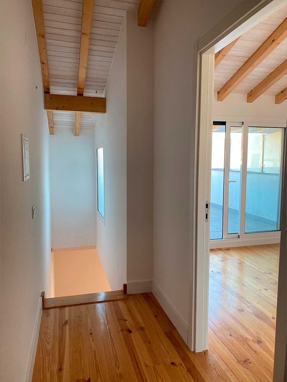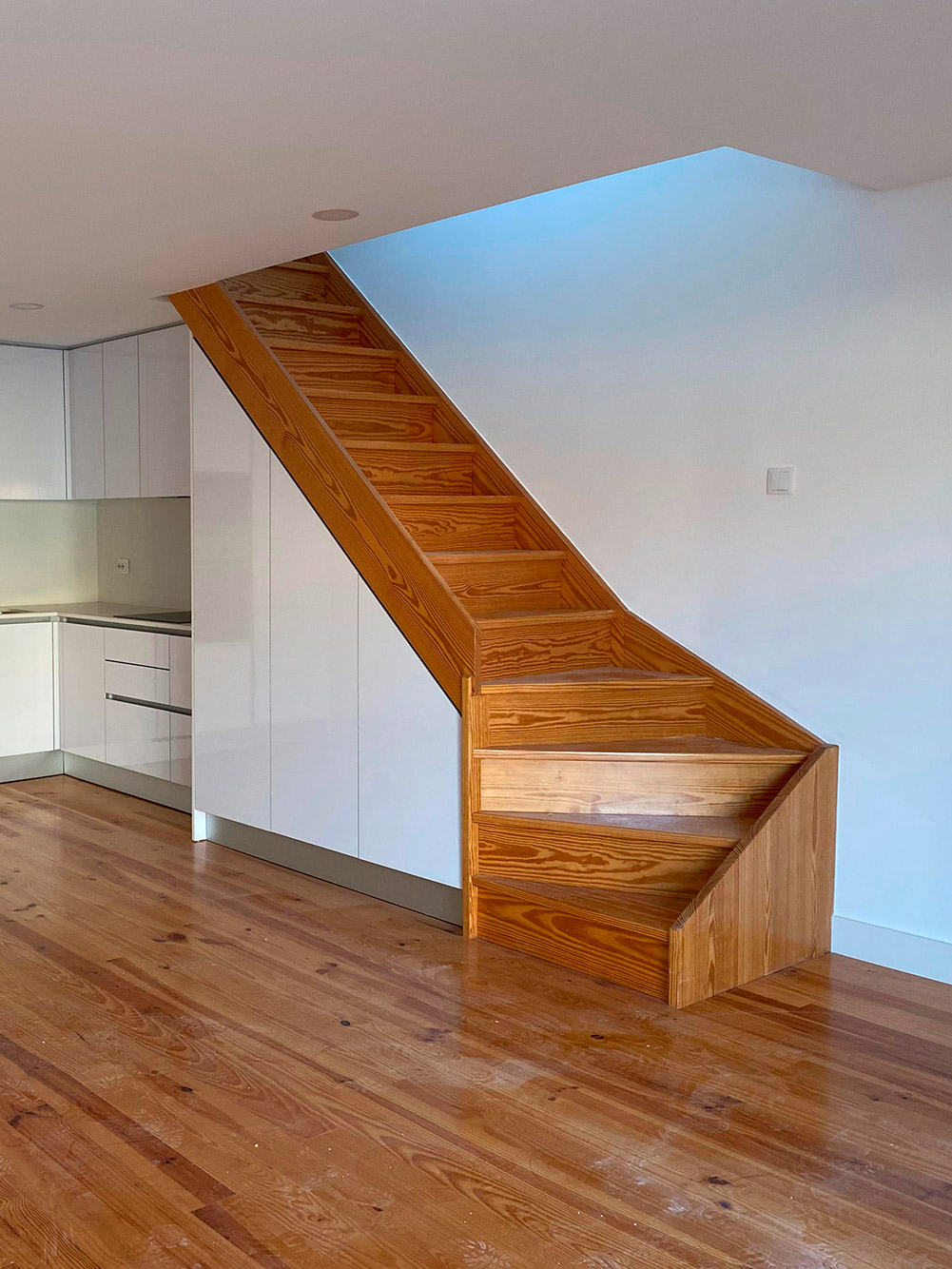 A intervenção incluiu trabalhos de estuque e pintura, reabilitação de elementos degradados, e a renovação das zonas comuns, respeitando a identidade do edifício e as exigências técnicas da obra.